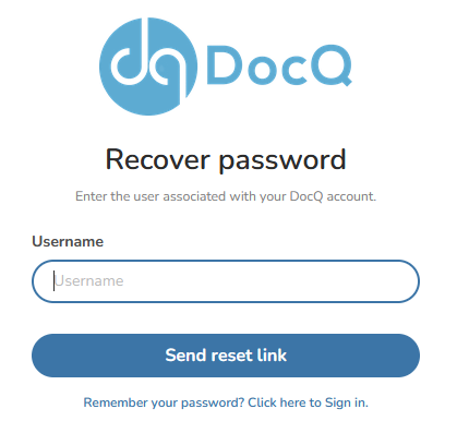 If you forgot your password, click the Forgot Password link on the login page. Enter your username and click Reset my password. A password reset email will be sent to the email address associated with your DocQ profile.